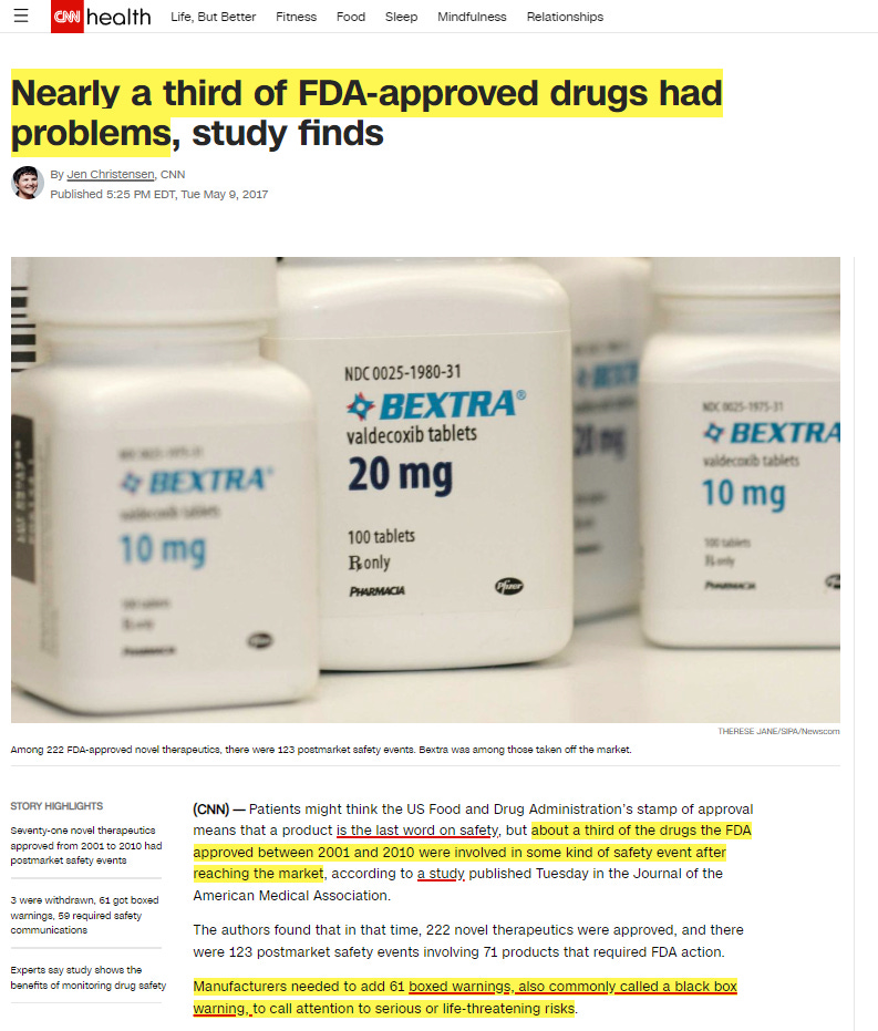 A more recent study in 2017 showed that “nearly a third of FDA-approved drugs had problems… As the study notes, the majority of these drugs were trialed in 1,000 or fewer patients to get FDA approval”.