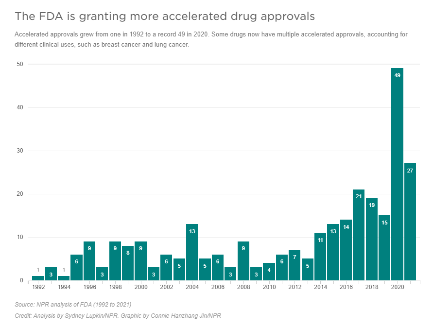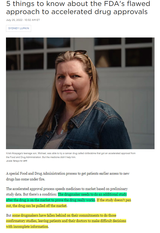 This 2022 NPR article shows that badly this process is accelerating. Now, new drugs “need to do an additional study after the drug is on the market to prove the drug really works.” As the article notes, many companies have “fallen behind” in completing their “confirmatory” studies to show that their drugs really work.