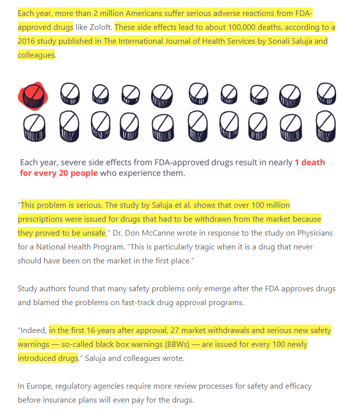 The FDA approves drugs, but its standards have been slipping for some time. This 2013 Harvard blog highlights that one in every five approved drugs “ends up causing serious harm.” Also noteworthy, 90% of all new drugs have “little” benefit over existing drugs and there are 53,000 excess hospitalizations and 2400 excess deaths every week.