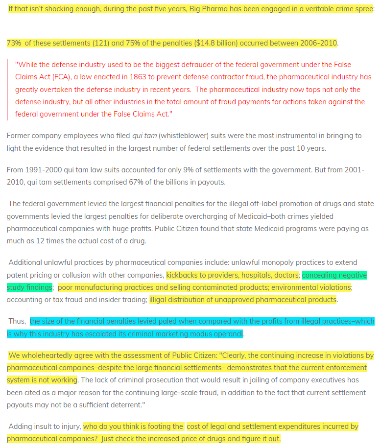 Even worse, the rate of fines has been increasing in past years. Pharma companies have figured out that they can get by the fines by increasing drug prices. In other words, the fines are not incentivizing the companies to stop illegal activity:
