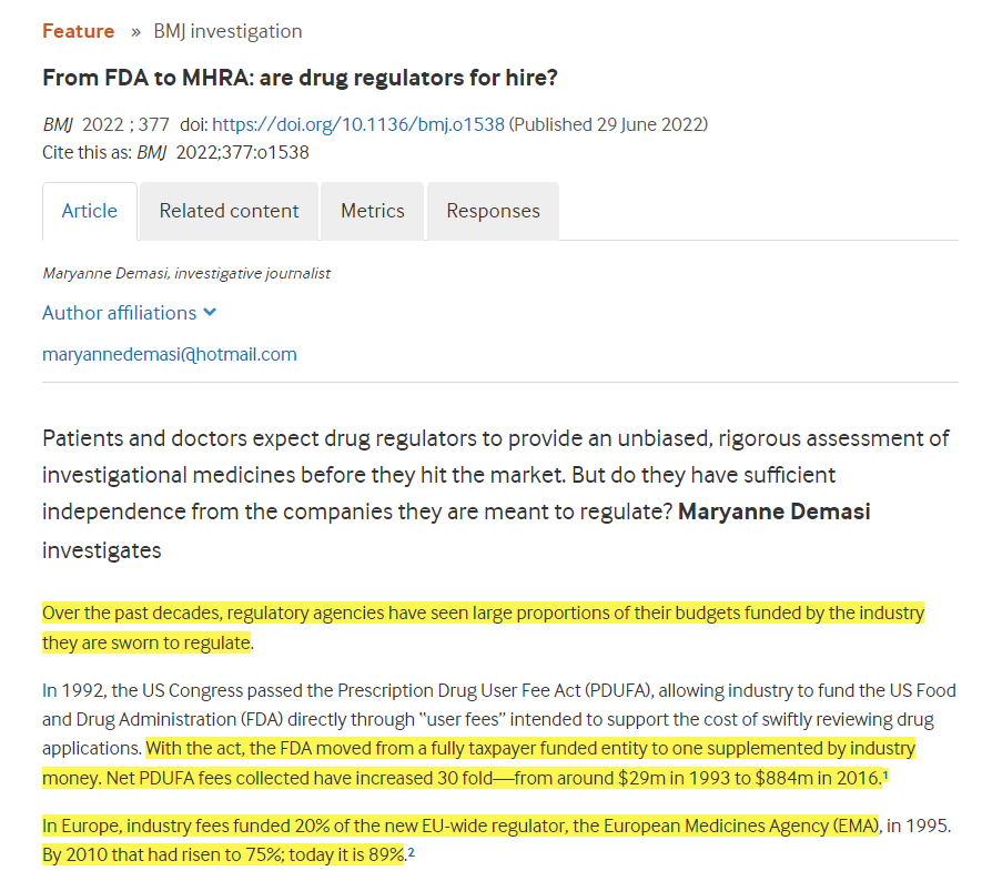 Who funds the regulators? Well, actually it’s mostly the companies now in several of the largest economies. This BMJ investigation reveals the US has increased its fees from the pharma industry “30 fold”, 65% of the FDA budget, and the EMA receives 89% of its budget covered by the pharma industry: